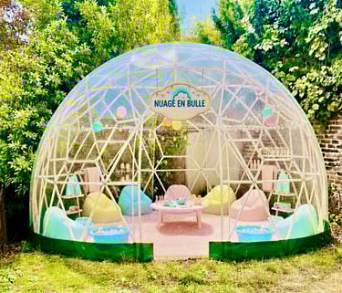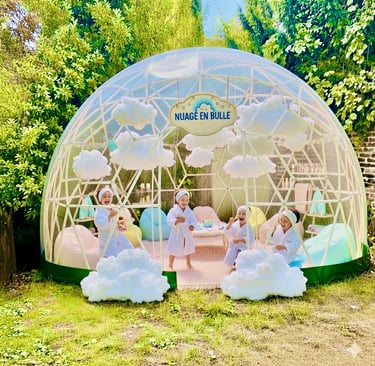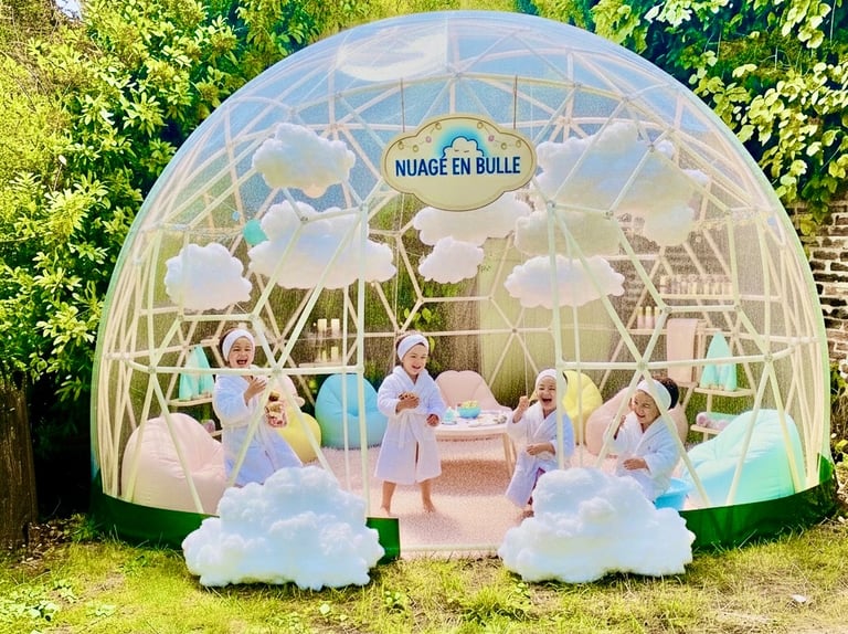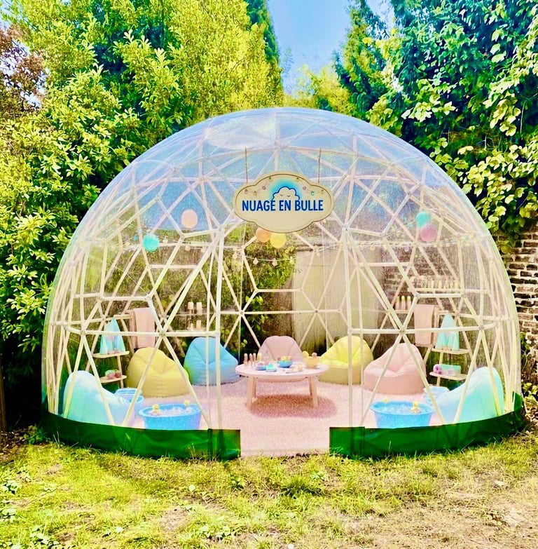 Au cœur du jardin, la bulle laisse entrer la lumière, la nature et le calme. Elle permet aux enfants de se sentir ailleurs, loin du bruit, dans un endroit pensé uniquement pour eux. Un lieu où ils peuvent se détendre, rêver, s’exprimer et briller en toute simplicité.